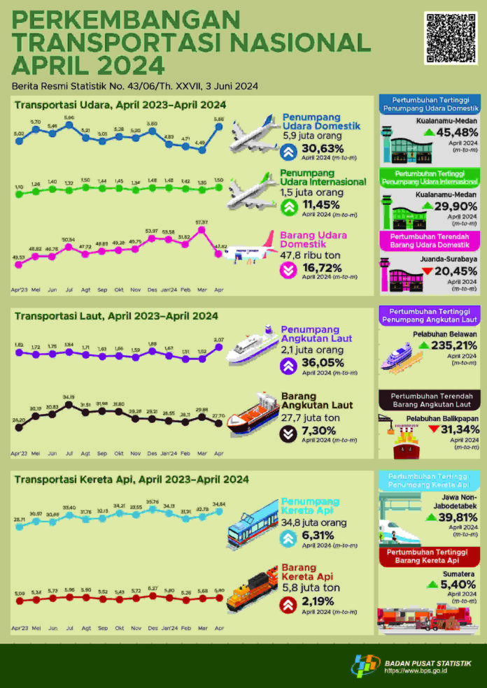 Jumlah penumpang kereta yang berangkat pada April 2024 sebanyak 34,8 juta orang, naik 6,31% dibanding Maret 2024. Serupa dengan jumlah penumpang, jumlah barang yang diangkut dengan kereta mengalami peningkatan sebesar 2,19% menjadi 5,8 juta ton.