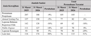 Jumlah sanksi kategori ‘Lain-lain’ melonjak hingga 50% menjadi 174 sanksi dari 116. Dari sisi jumlah perusahaan, terdapat kenaikan 51% menjadi 115 emiten pada periode 31 Maret 2026 ketimbang 76 perusahaan tercatat.