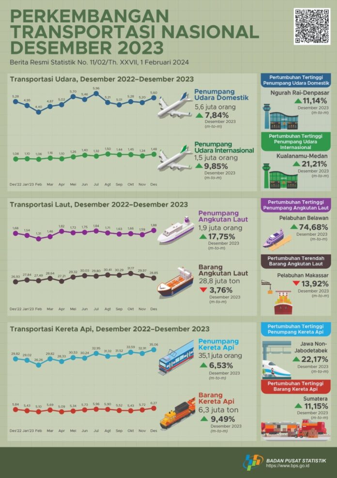 Jumlah penumpang kereta api yang berangkat pada Desember 2023 sebanyak 35,1 juta orang atau naik 6,53% dibanding November 2023. Serupa dengan jumlah penumpang, jumlah barang yang diangkut kereta api mengalami peningkatan sebesar 9,49% menjadi 6,3 juta ton.