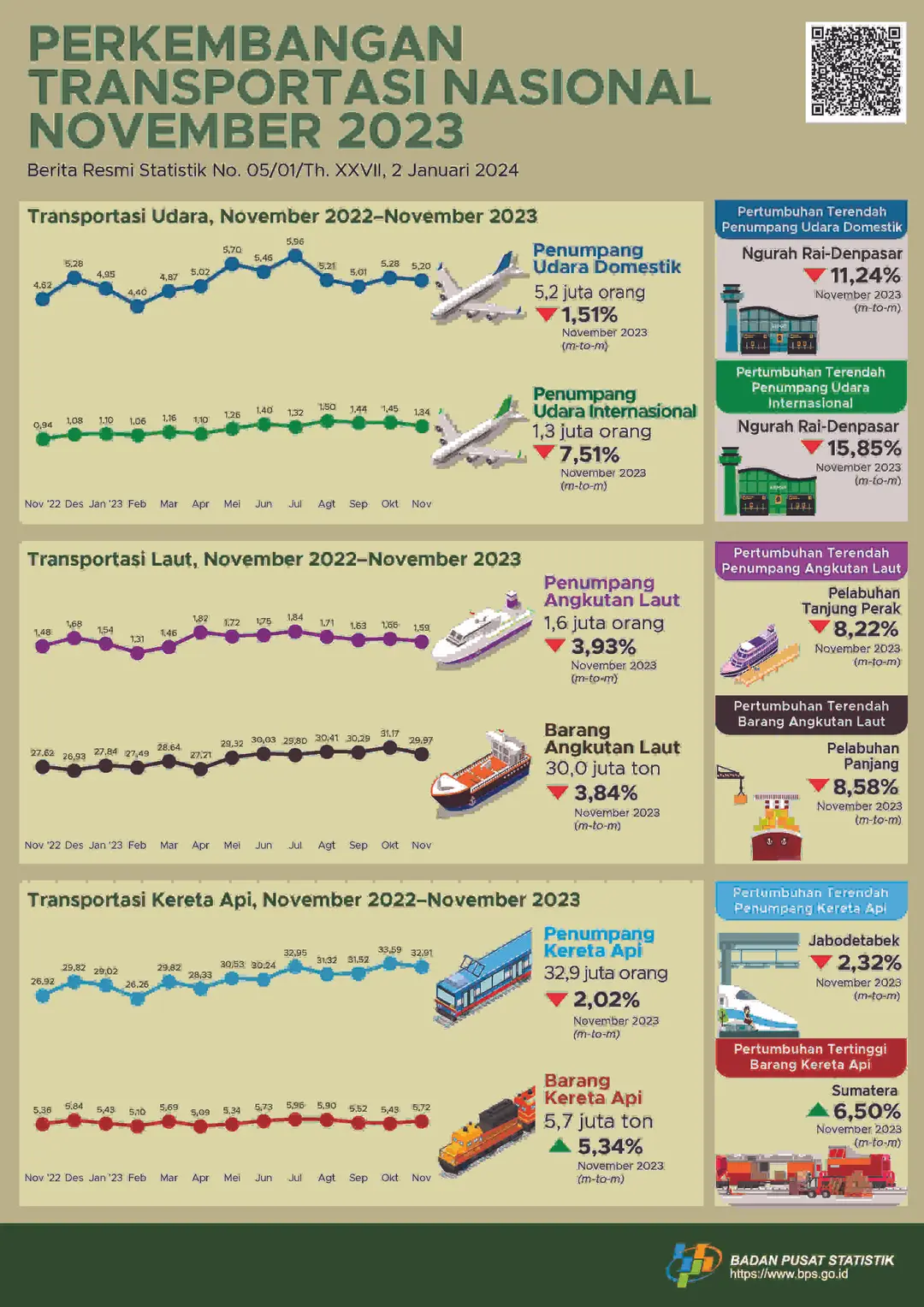 Menurut data BPS, jumlah penumpang angkutan udara domestik yang berangkat pada November 2023 sebanyak 5,2 juta orang atau turun 1,51% dibanding kondisi pada Oktober 2023. Jumlah penumpang tujuan luar negeri (internasional) turun 7,51% menjadi 1,3 juta orang.