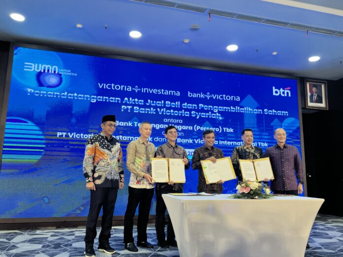 STOCKWATCH.ID (JAKARTA) – PT Bank Tabungan Negara (Persero) Tbk (BBTN) resmi menandatangani akta jual beli dan pengambilalihan saham PT Bank Victoria Syariah di Jakarta, Kamis (5/6/2025). Penandatanganan ini dilakukan bersama PT Victoria Investama Tbk (VICO) dan PT Bank Victoria International Tbk (BVIC).