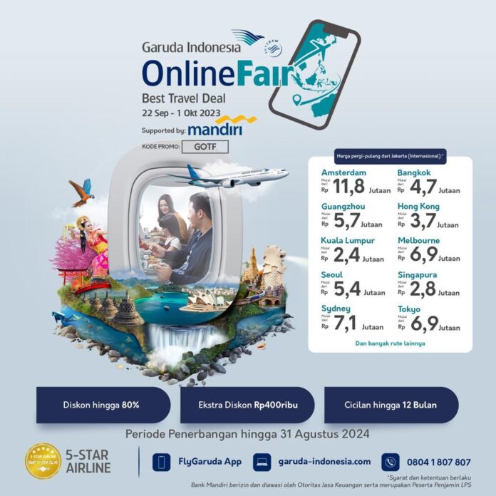 STOCKWATCH.ID (JAKARTA) – Maskapai penerbangan nasional Garuda Indonesia melalui program Garuda Indonesia Online Travel Fair (GOTF) kembali menawarkan potongan harga spesial sampai dengan 80 persen baik untuk perjalanan domestik maupun internasional untuk periode pemesanan mulai 22 September s.d 1 Oktober 2023 dengan periode perjalanan hingga 31 Agustus 2024.