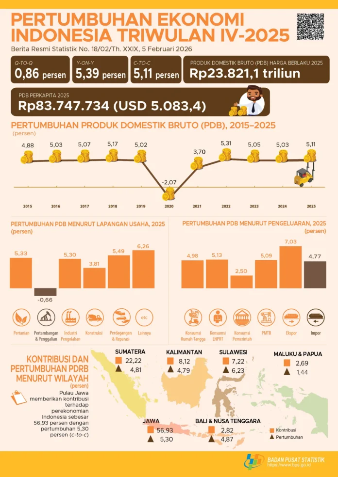 Berdasarkan rilis Badan Pusat Statistik (BPS) di Jakarta, Kamis (5/2/2026), Produk Domestik Bruto (PDB) atas dasar harga berlaku mencapai Rp23.821,1 triliun. Adapun PDB per kapita masyarakat Indonesia menyentuh angka Rp83,7 juta atau setara USD 5.083,4.
