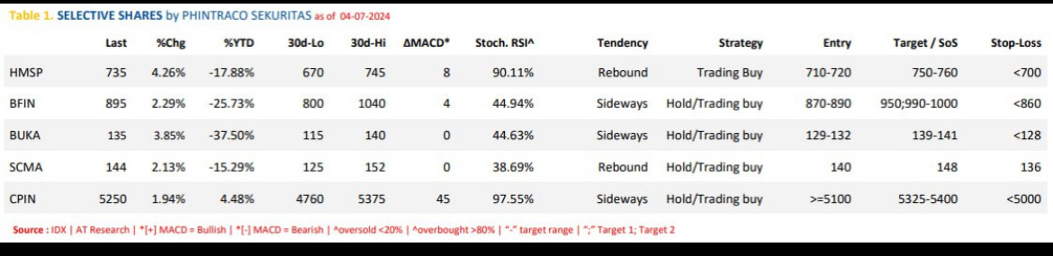 “Top picks di Jumat (5/7/2024) meliputi HMSP, BFIN, BUKA, MAIN dan CPIN” jelas tim analis Phintraco Sekuritas,”