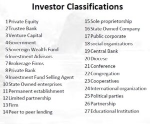 Ke-27 sub-tipe tersebut mencakup berbagai entitas investasi dan organisasi. Beberapa di antaranya adalah Private Equity, Trustee Bank, Venture Capital, Government, Sovereign Wealth Fund, serta Investment Advisors.