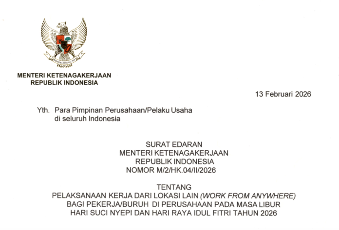Kebijakan tersebut tertuang dalam Surat Edaran Menteri Ketenagakerjaan Republik Indonesia Nomor M/2/HK.04/II/2026 tentang Pelaksanaan Kerja dari Lokasi Lain (Work From Anywhere) bagi Pekerja/Buruh di Perusahaan pada Masa Libur Hari Suci Nyepi dan Hari Raya Idulfitri Tahun 2026.