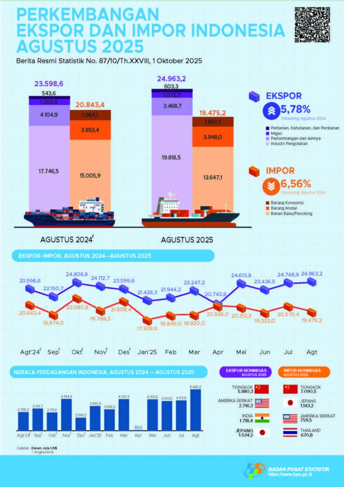 Sementara pada Agustus 2025, ekspor mencapai US$24,96 miliar, naik 5,78% dibanding Agustus 2024. Ekspor nonmigas Agustus 2025 mencapai US$23,89 miliar, naik 6,68% dibanding Agustus 2024.