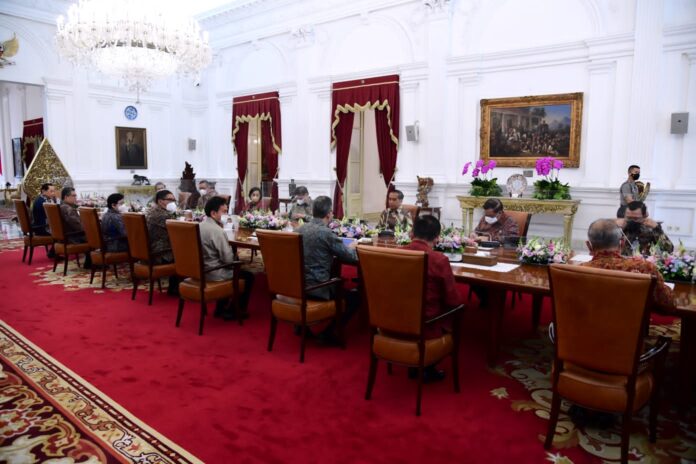 Turut mendampingi Presiden dalam pertemuan tersebut yaitu Menteri Koordinator Bidang Perekonomian Airlangga Hartarto, Menteri Keuangan Sri Mulyani, dan Sekretaris Kabinet Pramono Anung.