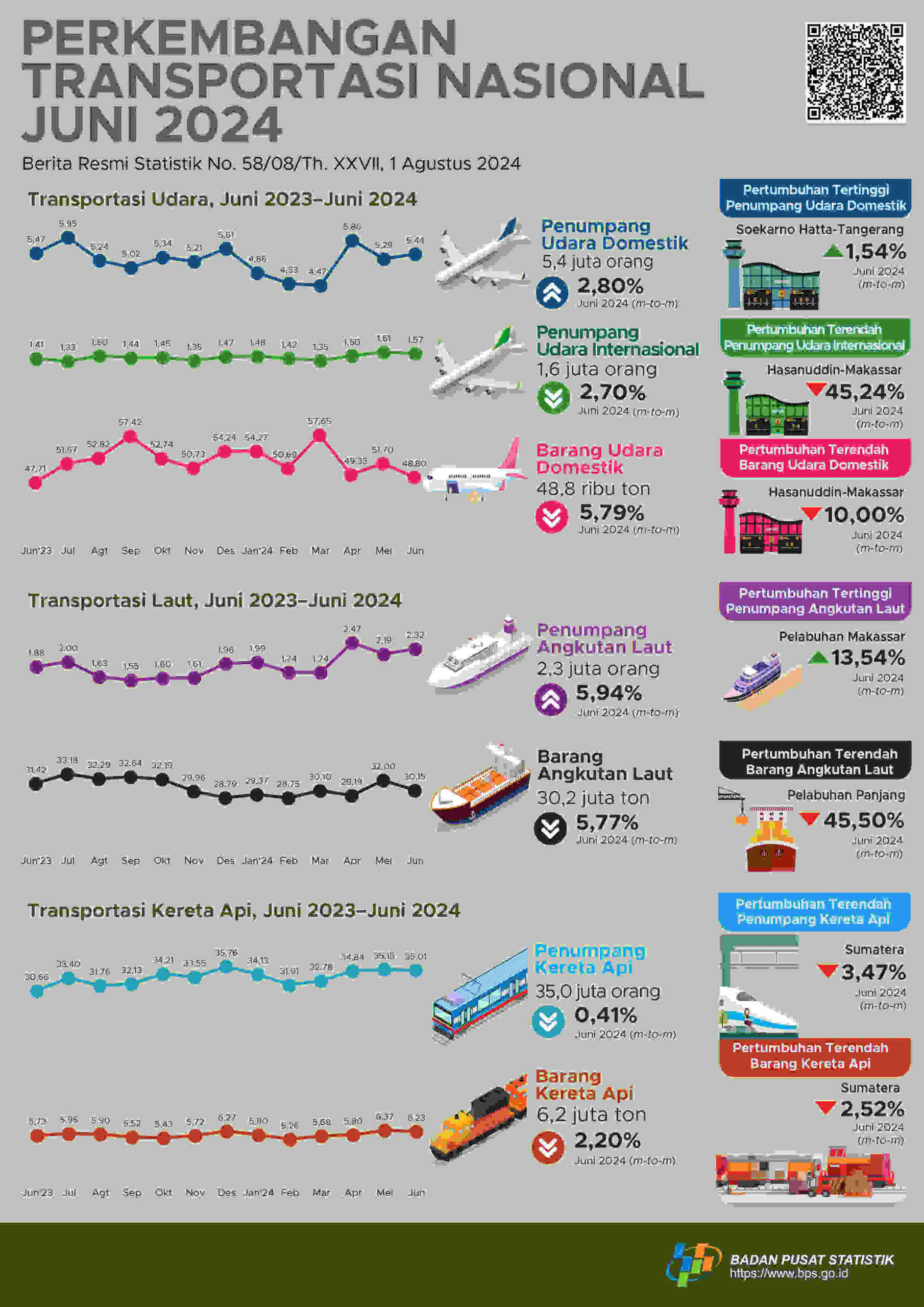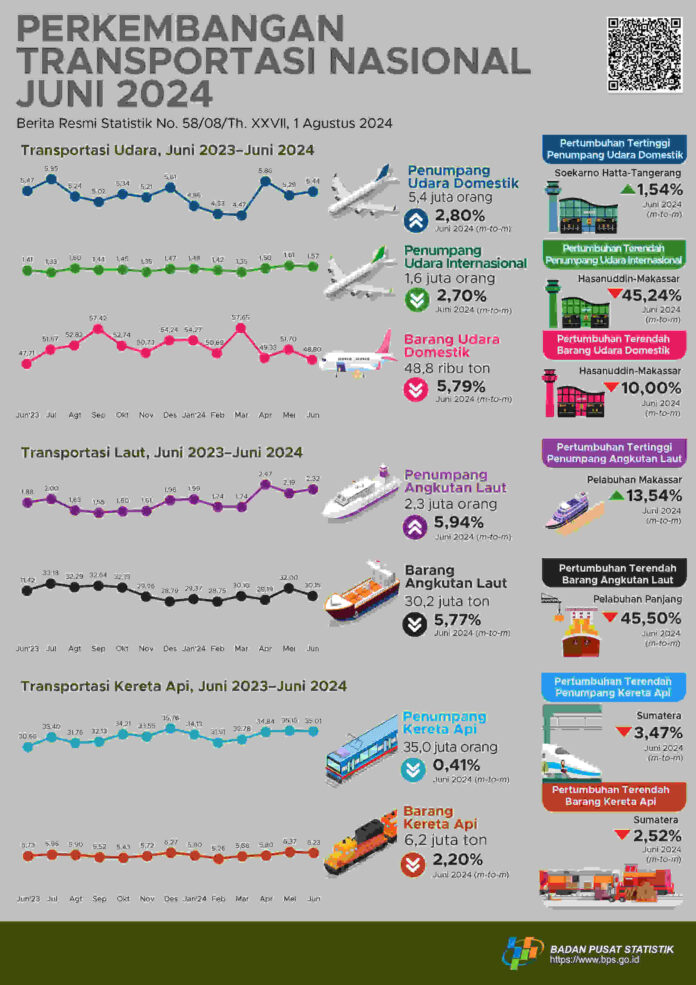 Adapun jumlah penumpang kereta yang berangkat pada Juni 2024 sebanyak 35,0 juta orang, turun 0,41% dibanding Mei 2024. Serupa dengan jumlah penumpang, jumlah barang yang diangkut dengan kereta mengalami penurunan 2,20% menjadi 6,2 juta ton.