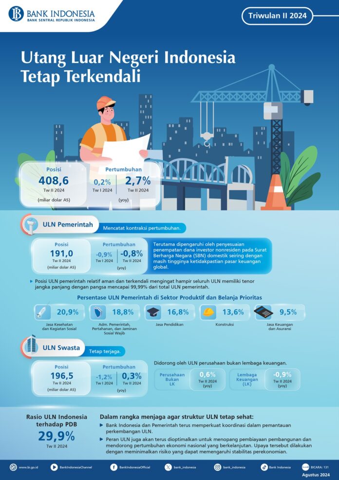 Posisi ULN Indonesia pada triwulan II 2024 tercatat sebesar US$408,6 miliar, tumbuh sebesar 2,7% (yoy), lebih tinggi dibandingkan pertumbuhan sebesar 0,2% (yoy) pada triwulan I 2024. Peningkatan tersebut bersumber dari ULN sektor publik maupun swasta.